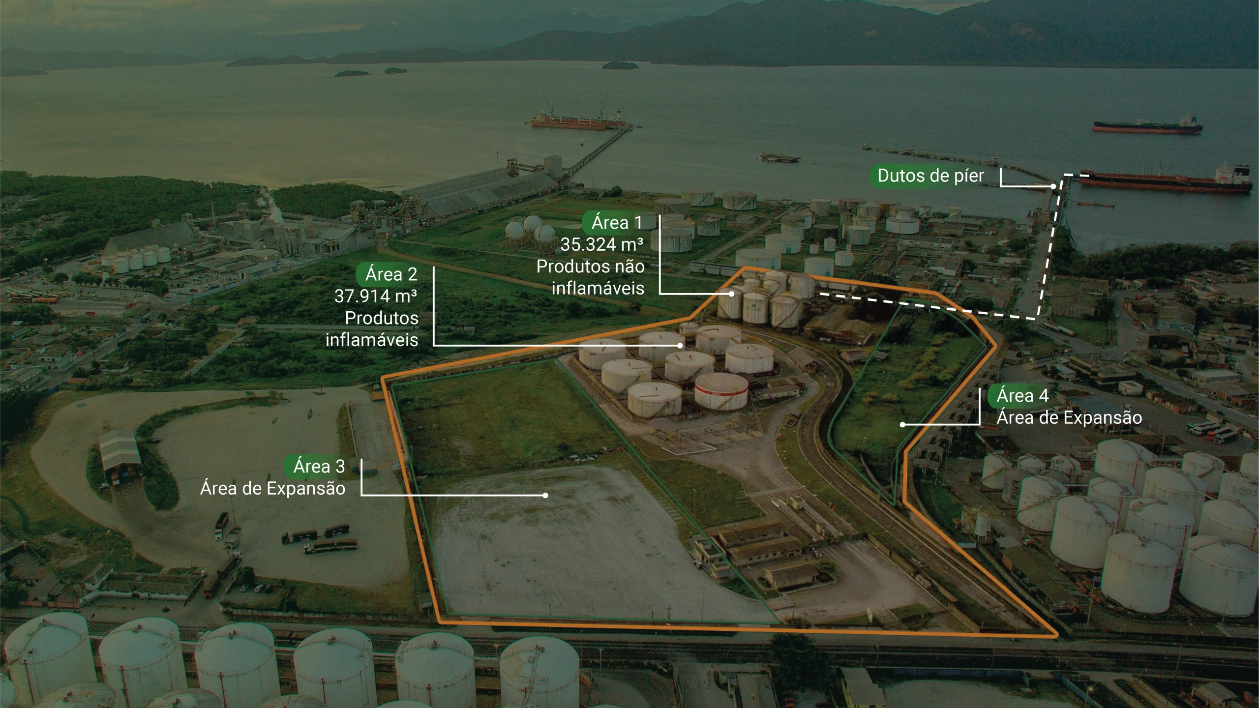 - Conexão ao píer público (2 berços) via 3 linhas de 8" aço carbono, 8" inox, 12" aço carbono – 1.050 m